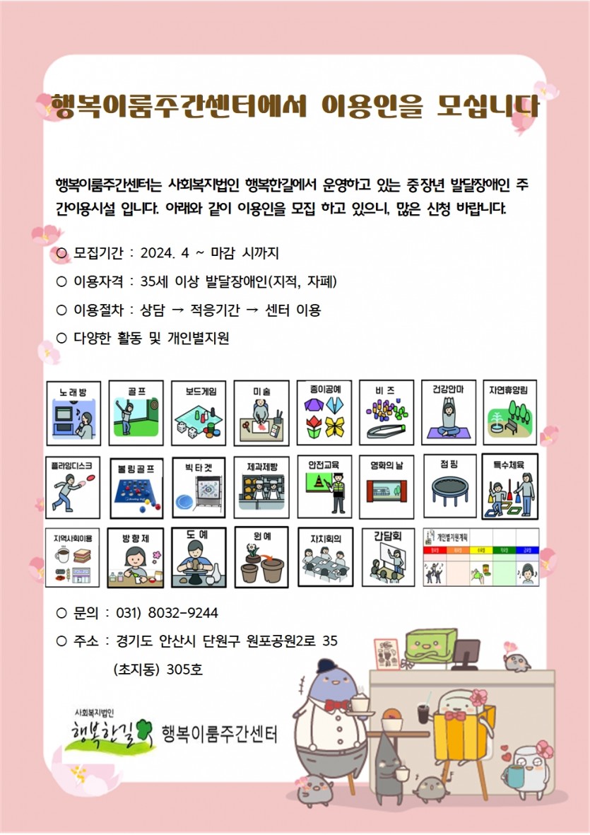 행복이룸주간센터에서 이용인을 모십니다. 페이지 정보 작성자 행복이룸o은화 댓글 0건 조회 2,732회 작성일 24-04-02 11:37 목록 본문 - 이전글[미리내장애인공동생활가정 직원구인] 정규직 직원(생활지도원)을 모집합니다 24.04.04 다음글[행복한길 직원구인] 정규직 직원(사회복지사-회계 담당)을 모집합니다(적격자없음) 24.04.01 댓글 0 댓글목록 등록된 댓글이 없습니다.